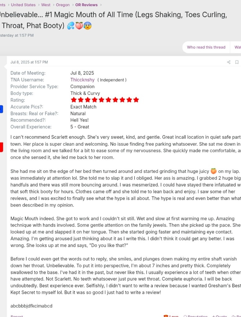 LAST DAY IN SALEM-DON'T MISS SEEING ME,YOU WILL REGRET IT! 🌹 Incall Rates Until 1pm 4/8🌹 (OC is normal rates)💋$100 - Short Stay 10mins 💋 $150 - Quick Visit 20mins 💋 $175 - Half Hour 💋 $225 - 45mins 💋 $275 - hr💋 $375 - 1.5 hr 💋 $475 - 2hr 💋 Hello Gentlemen Welcome to My World of Pleasure & Adventure. Come Explore Your Deepest Desires and fantasies with Me, Scarlett Harlott- Gresham's Best Kept Secret. I am a Fiery, Fun, Sassy, and Freaky 5'1 whirlwind mixture of German, Irish and Native. With sparkly blue/green eyes you can get lost in for hours, and a Juicy big spankable booty that's worship worthy,🐐 a Talented magic mouth that'll have your toes curlin', eyes rollin' and you temporarily forgettin' your name. I am a freak in the sheets, and a lady in the streets. 😏 🐐 I Give All The Fun Your Wifey Doesn't, Make Me Your Mistress, Step Mommy, or Girlfriend for an hour or two,or better yet for The Night! ☯ I am always seeking to building long-lasting genuine and authentic connections with respectful and generous individuals. ☯ Contact Me now via text or 🟩WhatsApp🟩 to have a 100% real, never rushed, exclusive & discreet mind blowing experience!🚫 (no calls please)🚫 ~~~~~~~~~~~~ 🌹 Incall Rates Until 1pm 4/8🌹 (OC is normal rates) 💋$100 - Short Stay 10mins 💋 $150 - Quick Visit 20mins 💋 $175 - Half Hour 💋 $225 - 45mins 💋 $275 - hr 💋 $375 - 1.5 hr 💋 $475 - 2hr 💋 ✨Let’s break the rules a little... 🤫 Let's explore the depths of pleasure, intimacy, and fantasy w/ my exclusive Girlfriend Experience Tempting, isn’t it❓ ♡♡♡♡♡♡♡♡| IC RATES | I only accept 💵cash OR 💲cashapp (w/ a +$10 inconvenience fee)☆ 💋QV ~ Gobble Gobble -$150💋Half-hour ~ Tease Your Senses – $225 💋 45mins ~ Dive Deeper - $275💋 1 hour ~ Satisfaction – $325 💋 1.5 Hours ~ Irresistible Indulgences – $425💋 2 Hours ~ Lose Track Of Time – $525 ♡♡♡♡♡♡♡♡| OC RATES | ☆+$50 minimum deposit required if drivetime is within 20 minutes or less. If drivetime is 25 minutes or longer or to Vancouver WA, deposit will be adjusted accordingly.☆ I accept 💲cashapp💲• 🔹️Amazon gift cards🔹️ or 🍦Vanilla visa gift cards🍦for deposits ONLY. ☆ ♡♡♡♡♡♡♡ ~+ ADD ONS+~ 🇬🇷🍑Greek •1hr-$475 •1.5hr-$575 •2hr-$675 -$75 is required as a deposit to book and secure the date- •Scheduled at least 3 hours in advance. 🍑🇬🇷 💬FaceTime-5mins(non sexual) ~ $50💬 🎥Record ~ + $50🎥 👗Outfit request ~ $25 if I have it-If I don't cost of outfit +$25👗 💦😋CoF ~~ +$100😋💦 💩Fetishes👣Kink have an addtional donation starting @ +$100 & up.🛐These are my standard GFE rates above ♡♡♡♡♡♡ 📨Contact Me via Text fiveOthree/threefoureight/zeronineoneseven OR 🟩WhatsApp 🟩to get ahold of me INSTANTLY📨🚫No Calls please 🚫 ♡♡♡♡♡♡ ✨✨Please be gentleman when contacting me, be respectful of me, my boundaries, time & energy, and you will receive the same in return. I can't wait to meet up and vibe! Xo Scarlett😘 ♡♡♡♡♡♡ ⏳I have a 50% cancelation if you NCNS, or cancel less than 3 hours due before I will book with you again⏳ 🚫BBFS🚫Explicit🚫/Vulgar talk on phone🚫Low balling/negotiating🚫 ♧Don't miss out on seeing me, you'll be sorry & regret it!♧ ♡🧳 🛬•👀•🛬•👀•🛬•👀•🛬•🛬WOULD YOU LIKE TO SEE ME IN YOUR CITY! D*M*T*Y•👀•🛬•👀•🛬•👀•🛬🧳♡